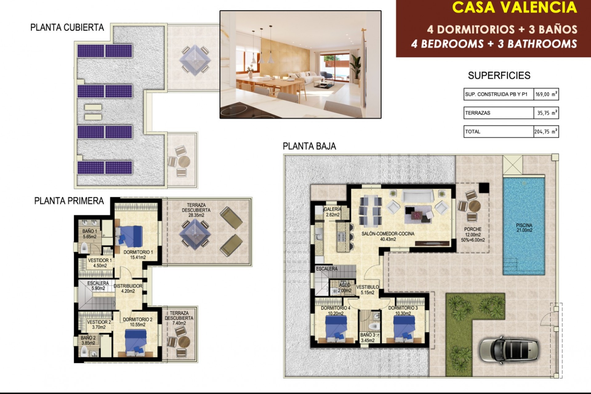 Aquí te presentamos VILLAS VALENCIA un subconjunto de 6 villas duplex independientes. Se distribuyen en 4 habitaciones, de las cuales 2 en suite con terrazas privadas, y 3 baños más un aseo de cortesía. En el área de día gran, confortable y luminoso salón-comedor con cocina americana, que abre a área exterior con porche y terraza, piscina, zona de estacionamiento y jardín terminado. En cubierta solárium.