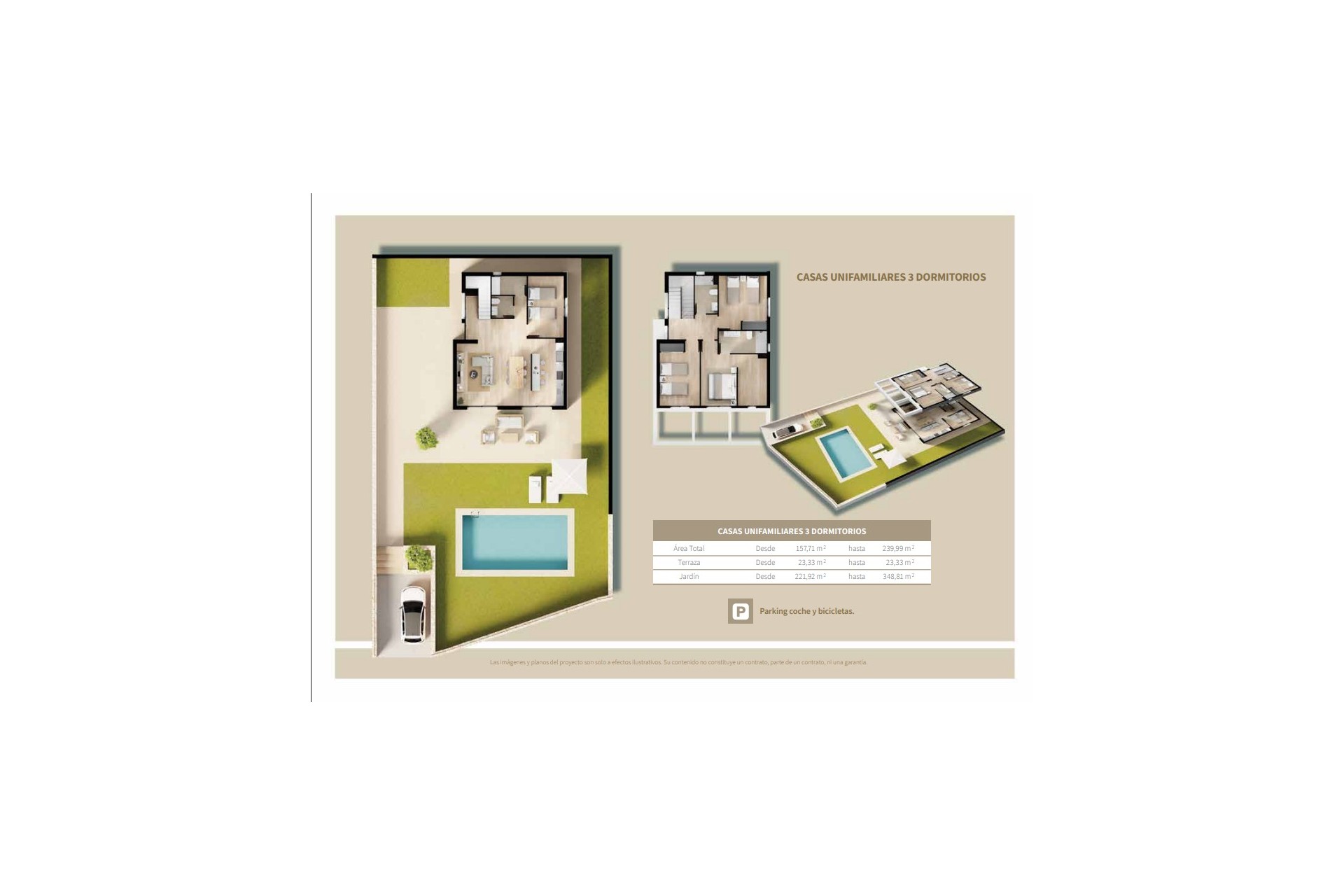 Las villas independientes se destacan por su elegante y cuidado diseño que ofrece exclusividad y confort. Distribuidas en 2 plantas y solárium con 4 habitaciones y 3 baños, amplio y luminoso salón con cocina abierta totalmente amueblada. En el exterior terraza y jardín (piscina opcional). Incluye baños amueblados incluyendo espejo y mamparas. Climatización frío/calor por conductos instalada con máquinas incluidas. Plaza de parking incluida con preinstalación para carga eléctrica. Aparcamiento para bicicletas