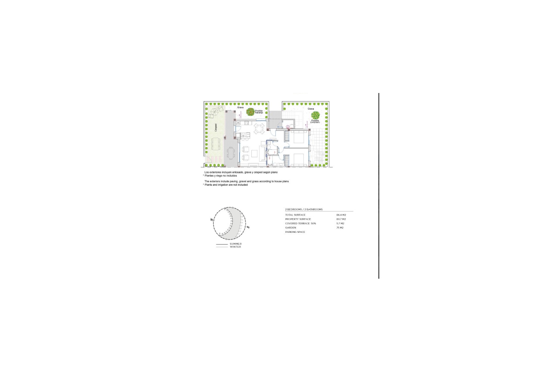 Cada apartamento cuenta con 2 habitaciones y 2 baños, además de un trastero y aparcamiento dentro de la urbanización. El residencial ofrece zonas comunes diseñadas para el disfrute y el relax, con una gran piscina comunitaria y amplias zonas verdes.