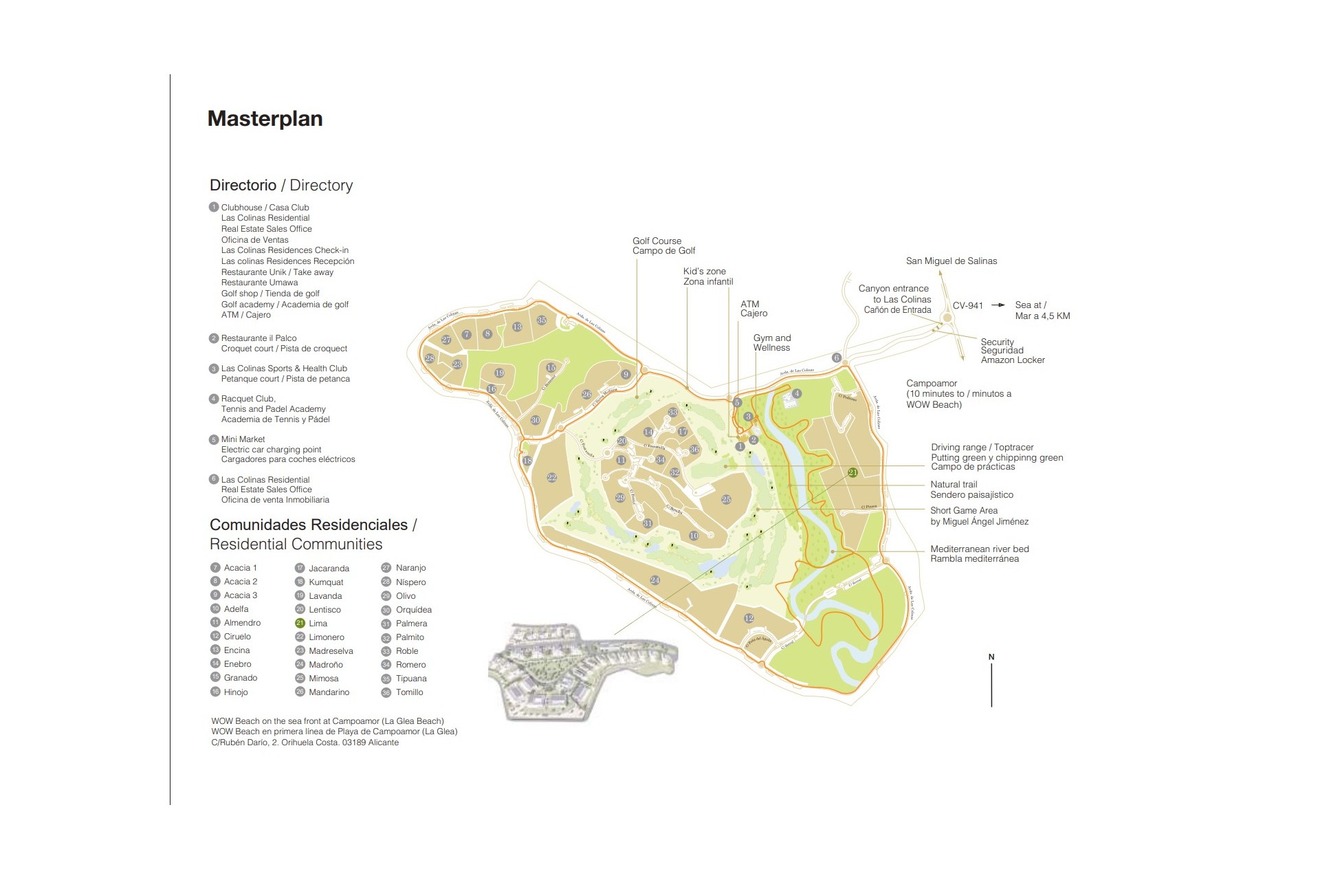 Wille znajdują się w ekskluzywnym nadmorskim ośrodku Club Resort z 18-dołkowym polem golfowym, pięknym klubem i pięknymi szlakami widokowymi. Wille oferują szeroki wybór sportów, wypoczynku, zakwaterowania i restauracji. Zaledwie kilka minut od pięknych śródziemnomorskich plaż. W pobliżu międzynarodowego szpitala, centrum handlowego i czterech międzynarodowych szkół. 50 minut od lotniska w Alicante i 45 minut od lotniska w Murcji.