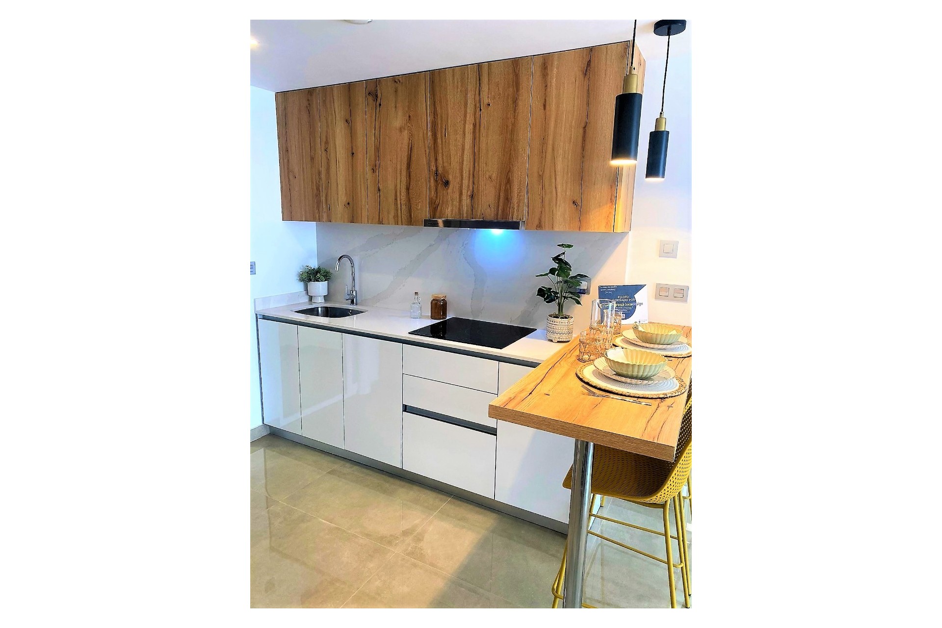 Kitchen furniture with designer high and low cabinets, glossy white and wood color