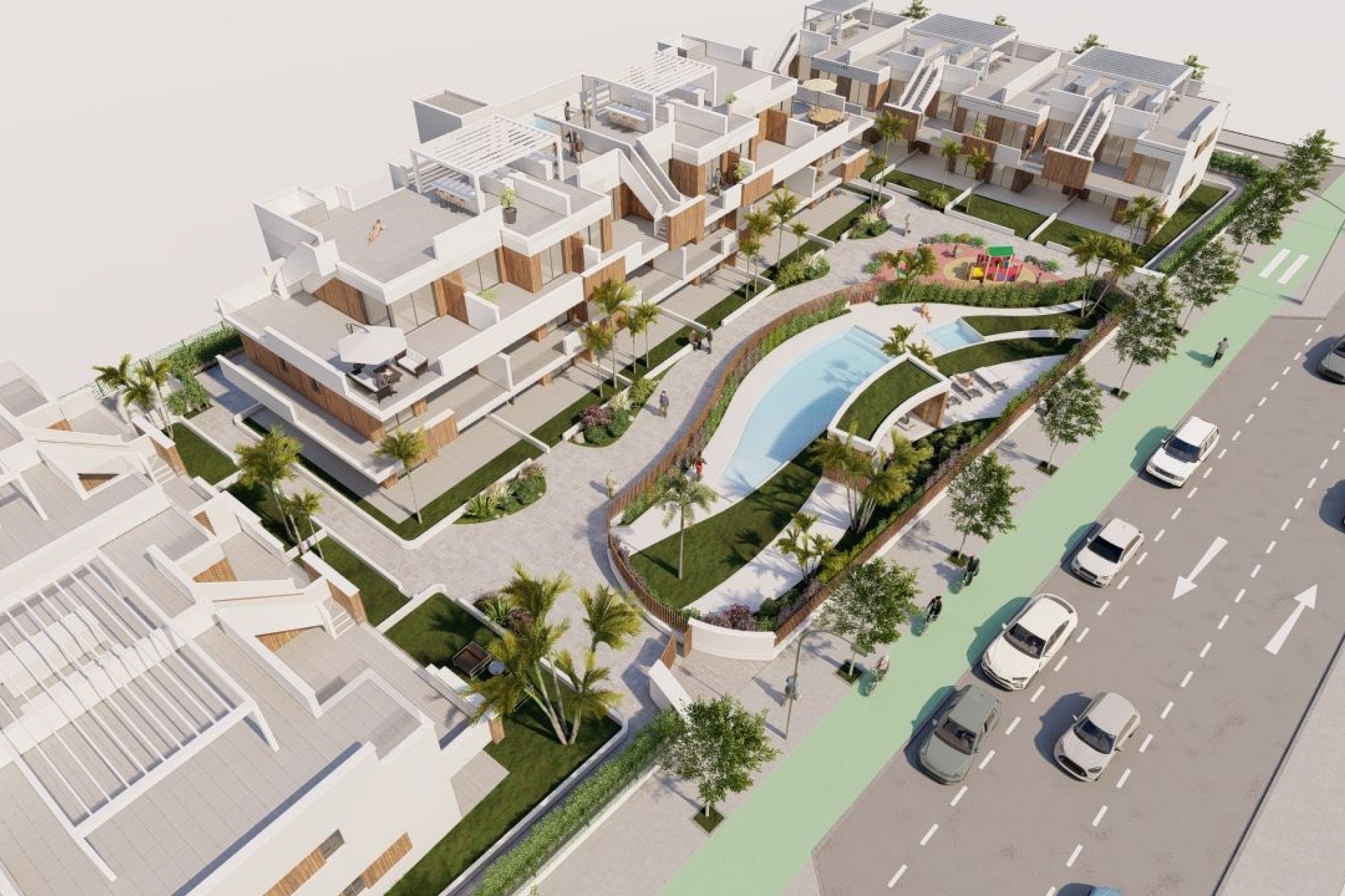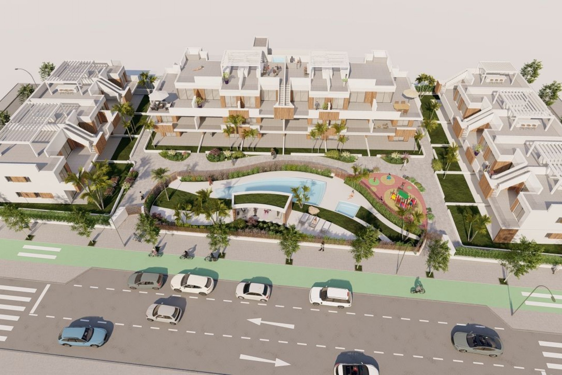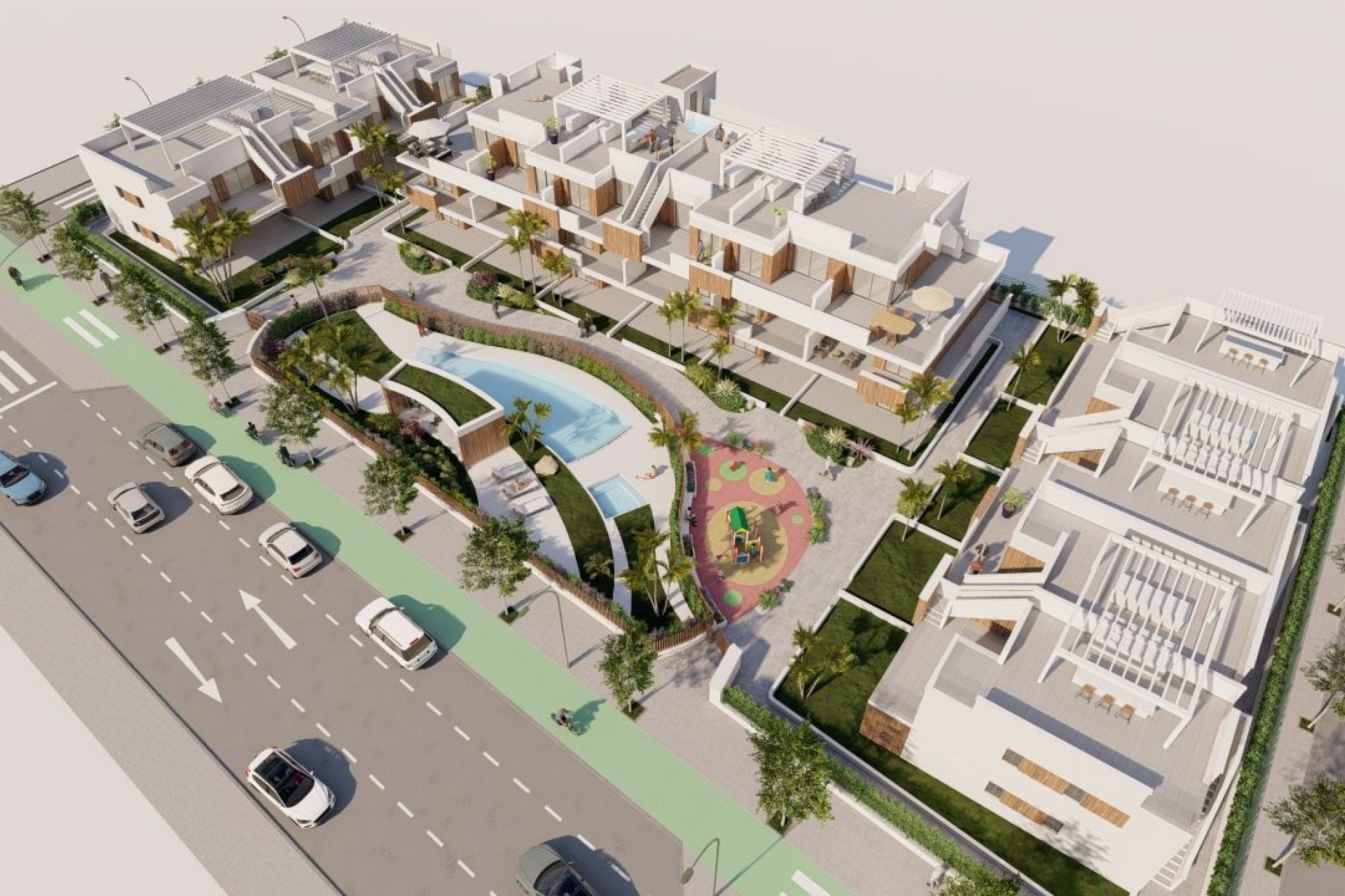 The residential is located in Pilar de la Horadada, a beautiful coastal city, where you will find all the necessary services at hand: supermarkets, pharmacies, health centers, banks, shops, cafes, restaurants with excellent cuisine. 6 minutes from the beach. 10 minutes from the Golf Course. 32 minutes from Murcia International Airport. 52 minutes from Alicante International Airport. It enjoys an excellent road network and public transportation service.