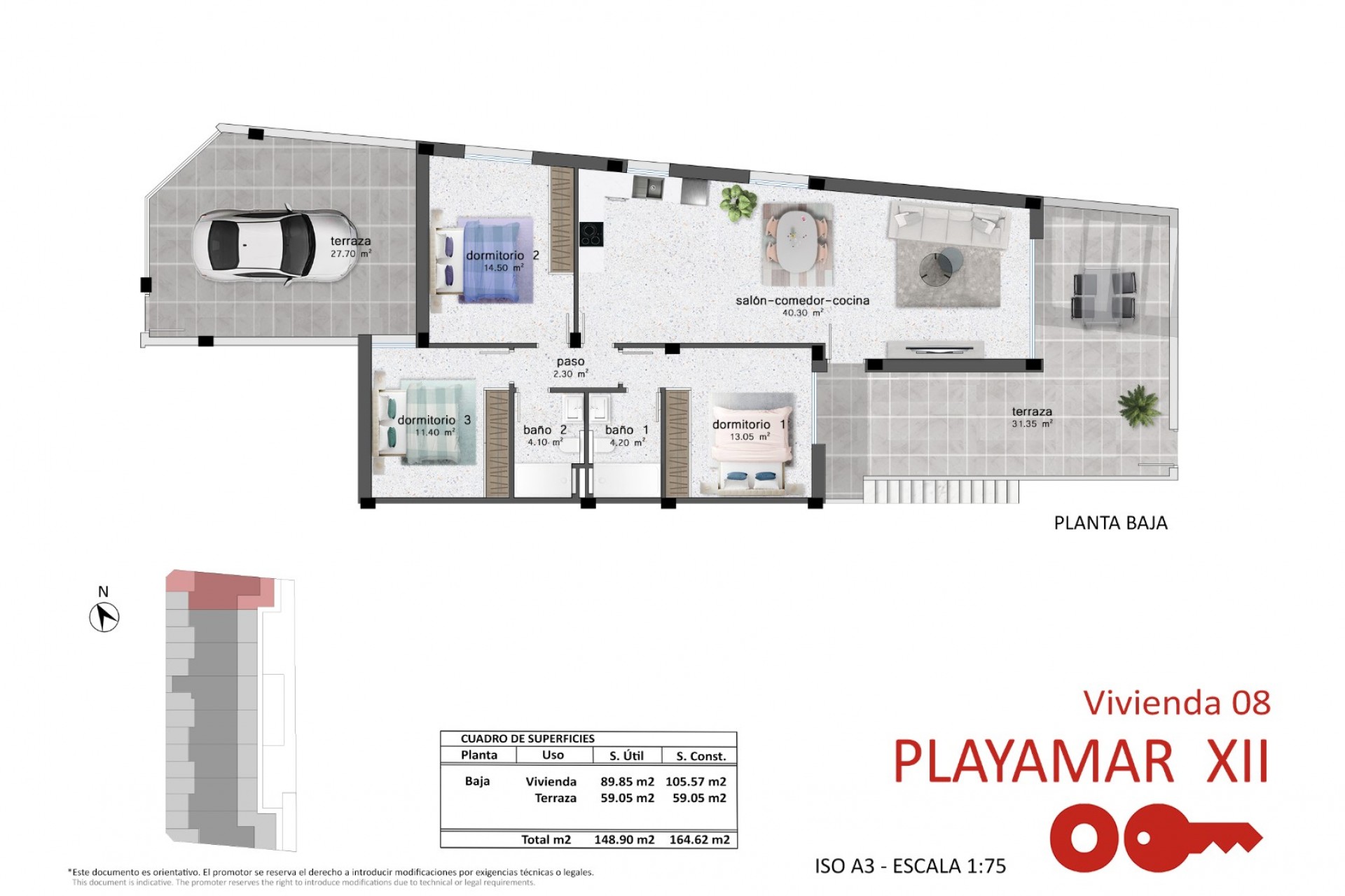 The apartment is located in the Residencial Playamar XII made up of 16 modern apartments. It is distributed in 3 bedrooms and 2 bathrooms, with the master bedroom en suite. Living-dining room with open kitchen that opens to the front terrace and large rear terrace. It has private parking.
