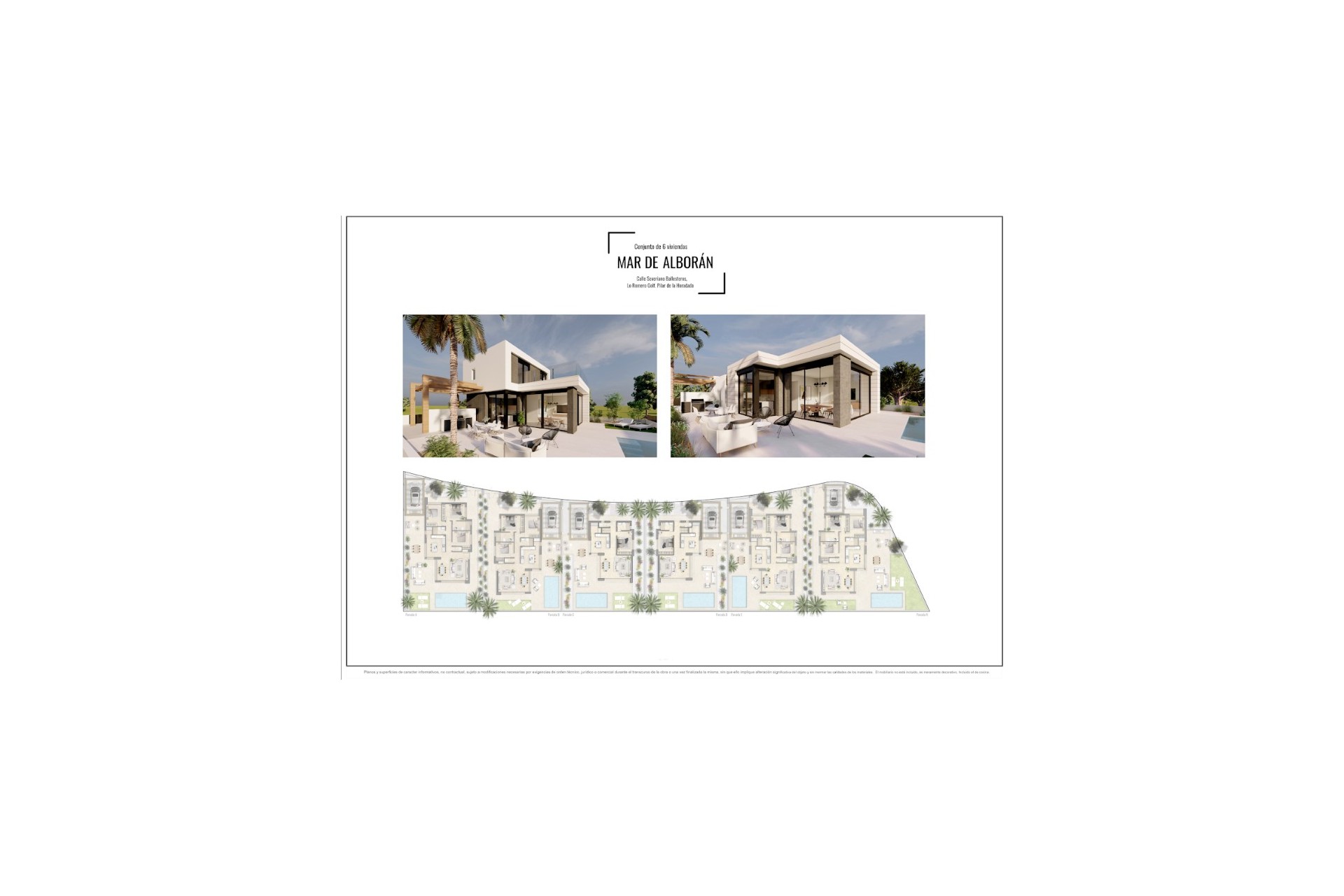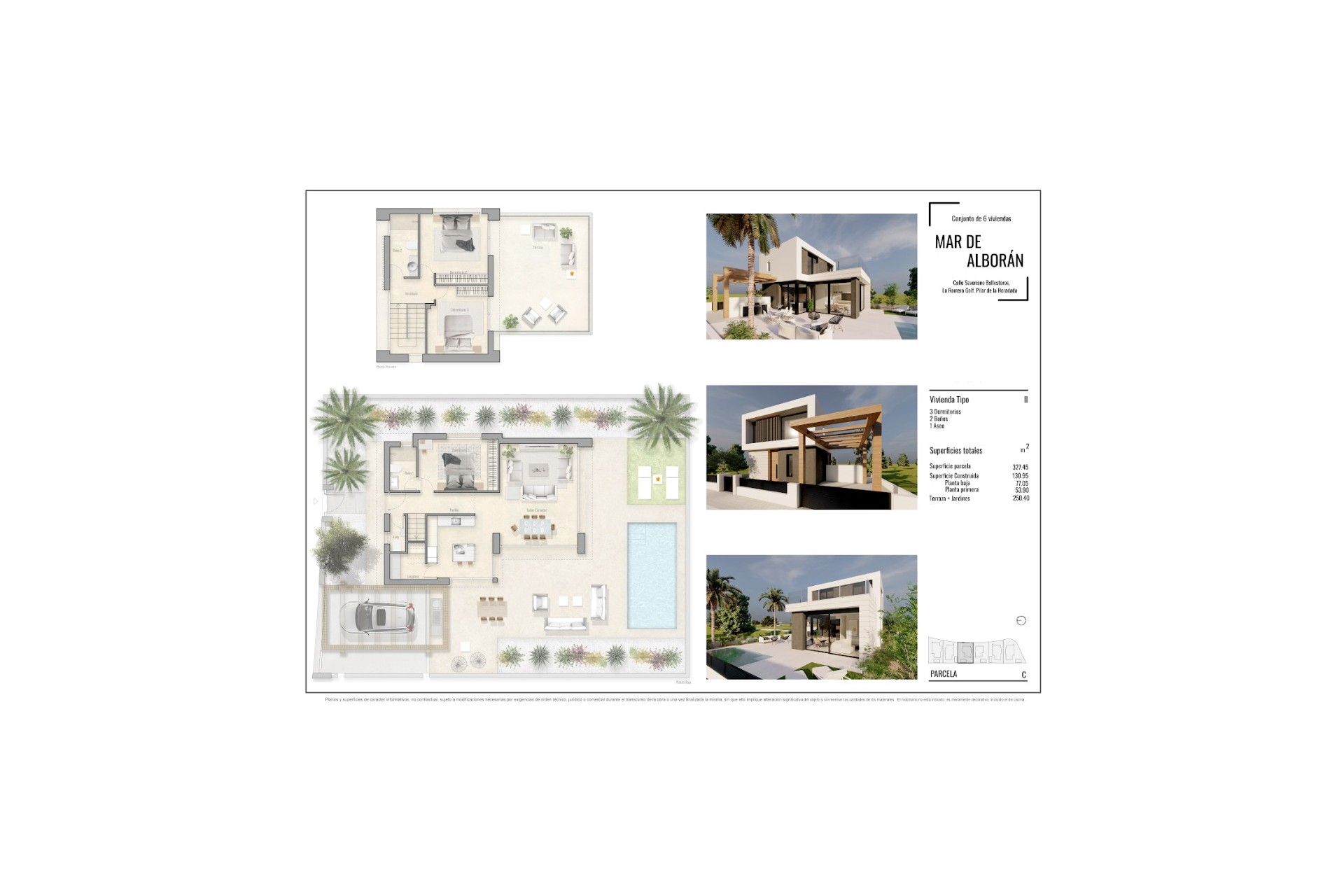 The price includes a fully furnished and equipped kitchen, bathrooms with underfloor heating, electric blinds, air conditioning, a landscaped garden with an irrigation system, a 6 x 3 m swimming pool, and on-site parking. Each plot is enclosed by a perimeter fence.