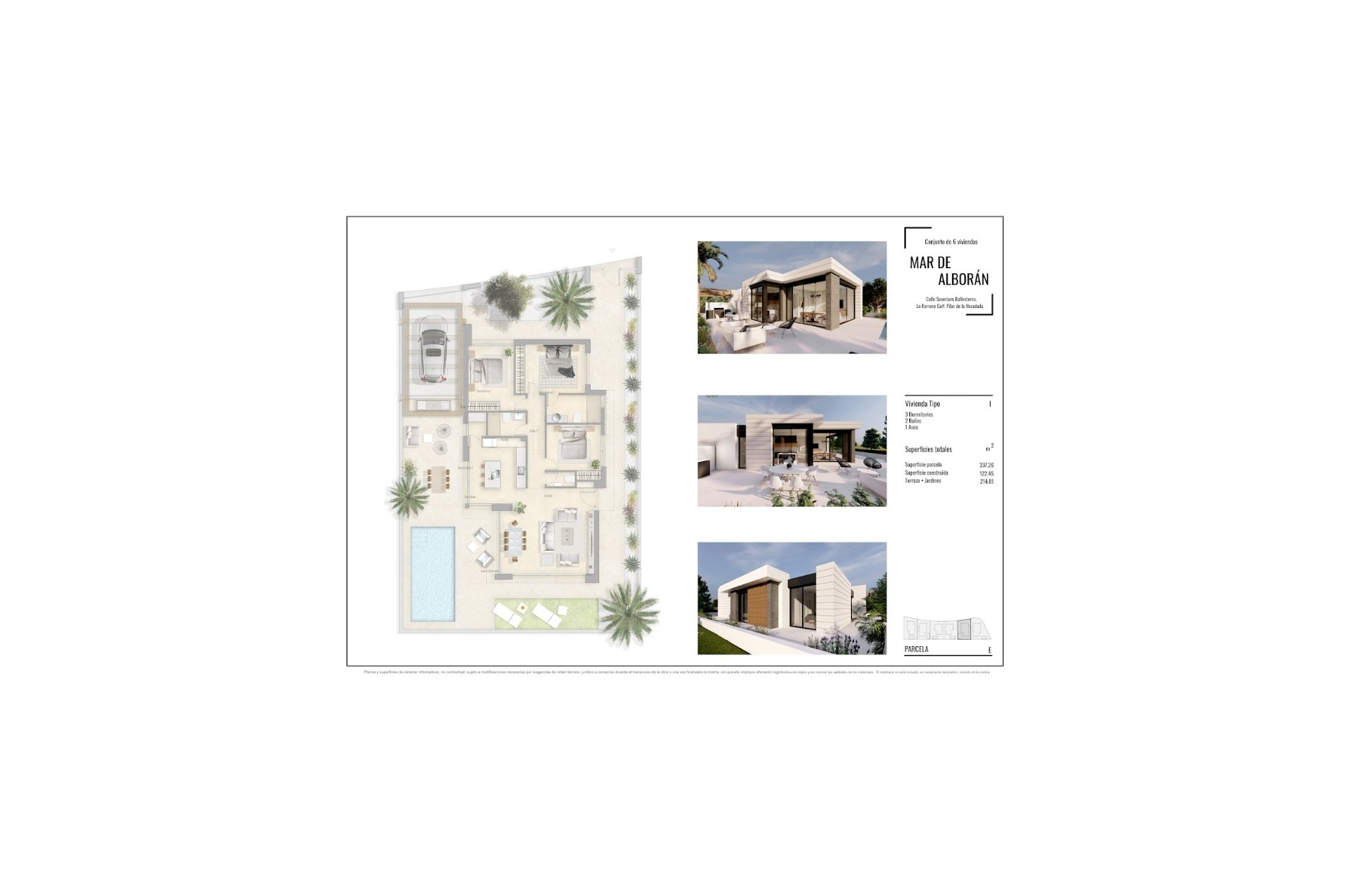 The price includes a fully furnished and equipped kitchen, bathrooms with underfloor heating, electric blinds, air conditioning, a landscaped garden with an irrigation system, a 6 x 3 m swimming pool, and on-site parking. Each plot is enclosed by a perimeter fence.