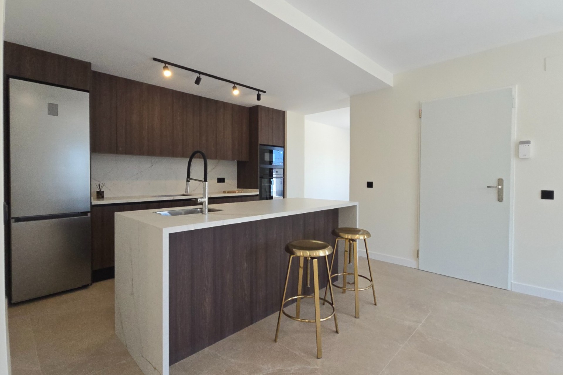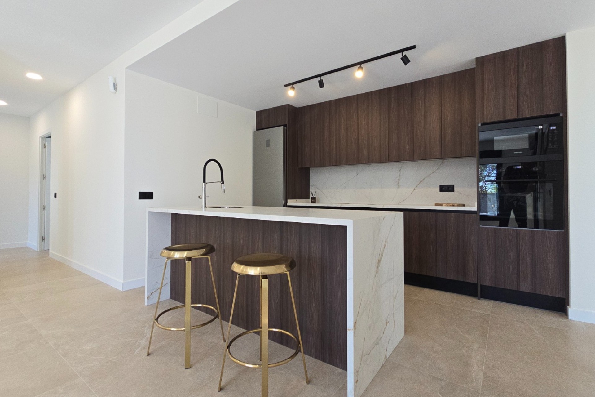 - Cocina de revista: Americana, con isla central, encimeras de porcelánico y equipada con electrodomésticos de primeras marcas (nevera, horno, micro, lavavajillas y campana).